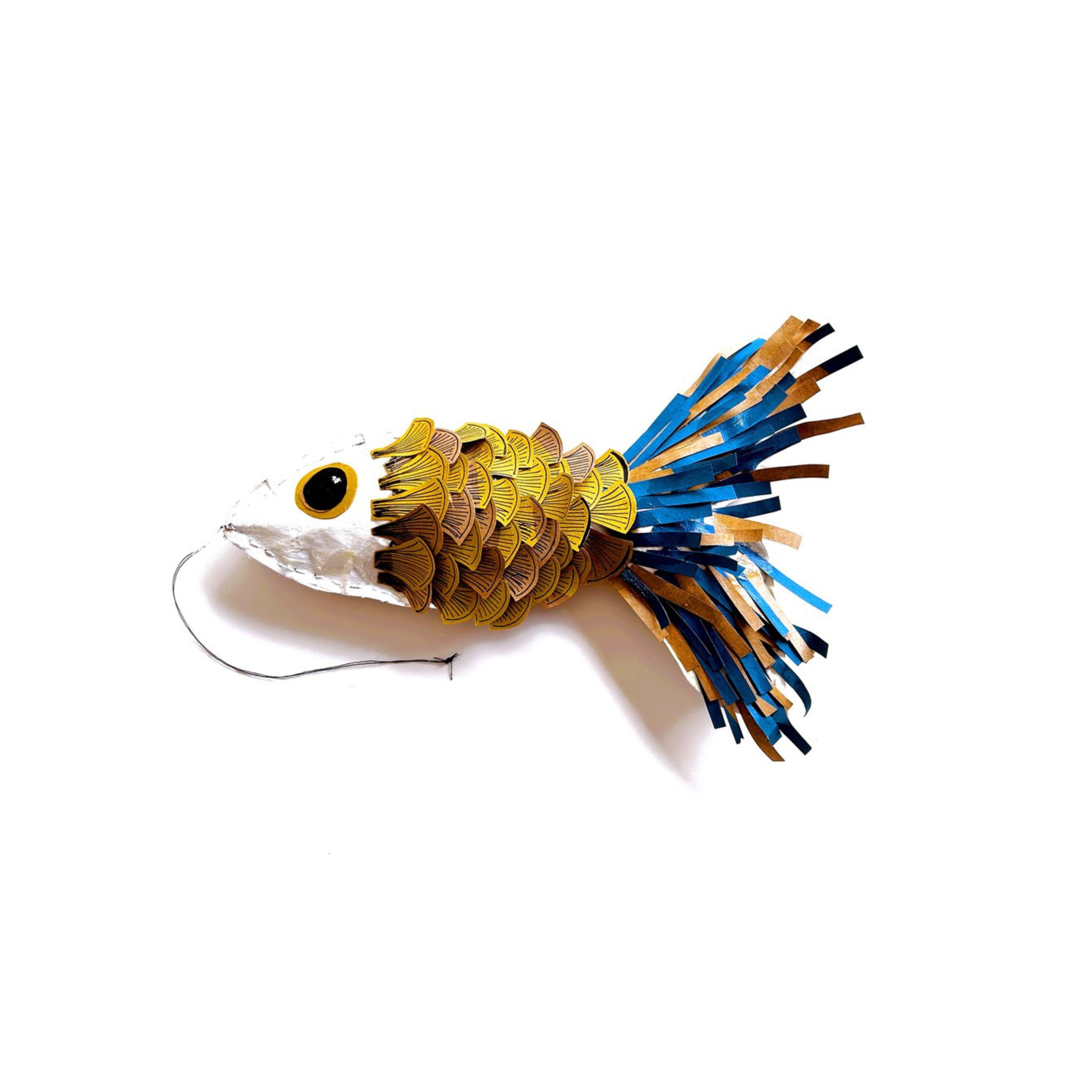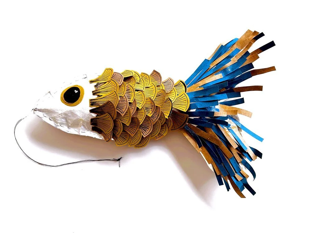 Paper Fish is an original sculpture, crafted from a sewn Walmart paper bag and layered with vibrant acrylic paint. This fun fish bursts with bold Southwestern desert vibes, blending recycled materials and vivid color.